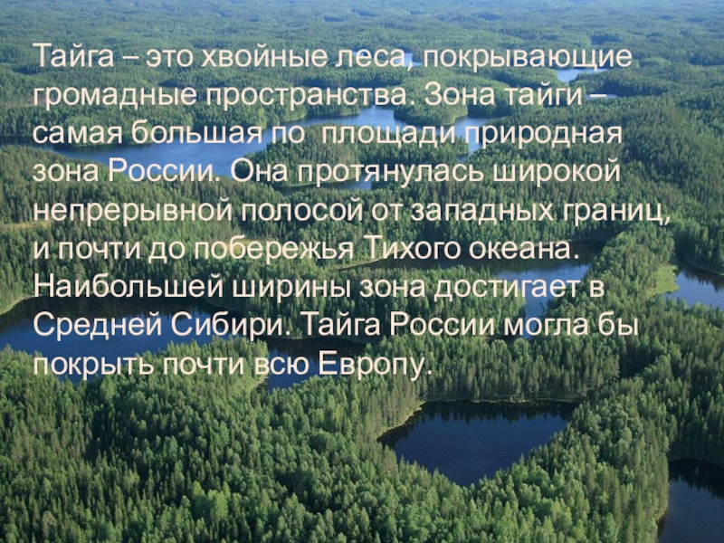 самая большая по площади природная зона России. Она протянулась широкой непрерывной полосой от западных границ, и почти до побережья Тихого океана. Наибольшей ширины зона достигает в Средней Сибири. Тайга России могла бы покрыть почти всю Европу.