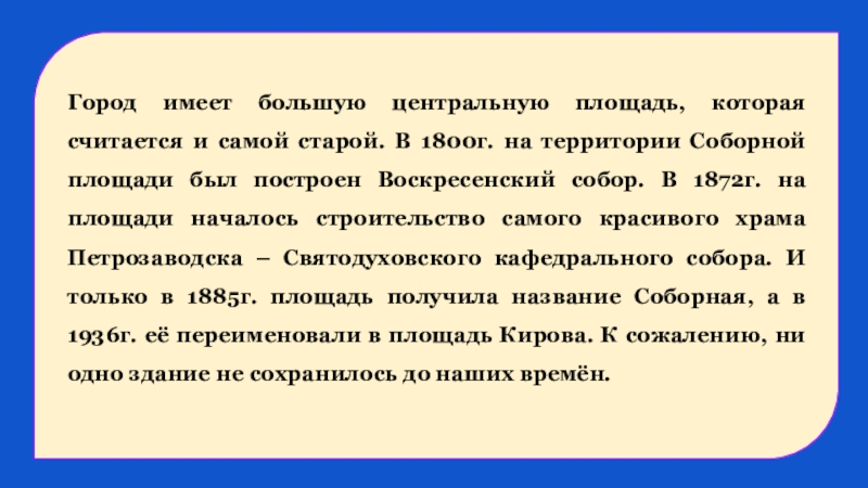 В 1800г. на территории Соборной площади был построен Воскресенский собор. В 1872г. на площади началось строительство самого красивого храма Петрозаводска – Святодуховского кафедрального собора. И только в 1885г. площадь получила название Соборная, а в 1936г. её переименовали в площадь Кирова. К сожалению, ни одно здание не сохранилось до наших времён.