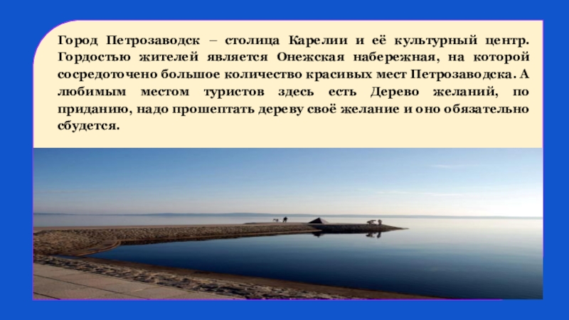 является Онежская набережная, на которой сосредоточено большое количество красивых мест Петрозаводска. А любимым местом туристов здесь есть Дерево желаний, по приданию, надо прошептать дереву своё желание и оно обязательно сбудется.
