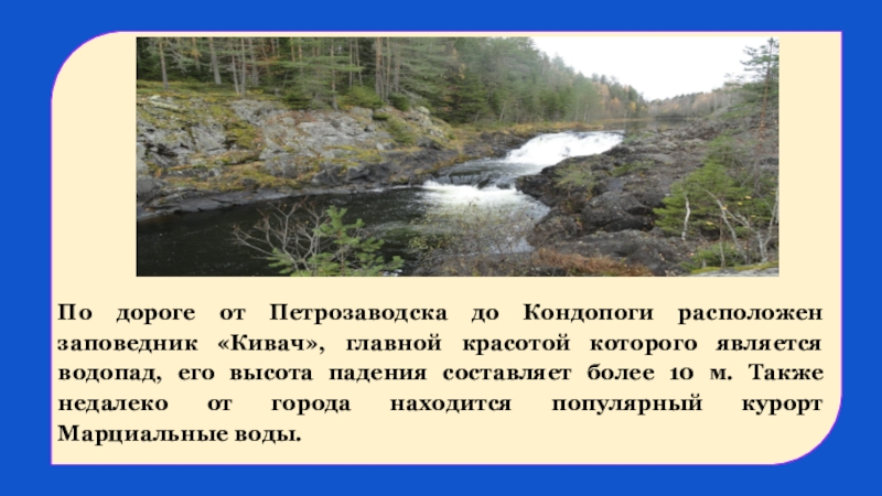 По дороге от Петрозаводска до Кондопоги расположен заповедник «Кивач», главной красотой которого является водопад, его высота падения