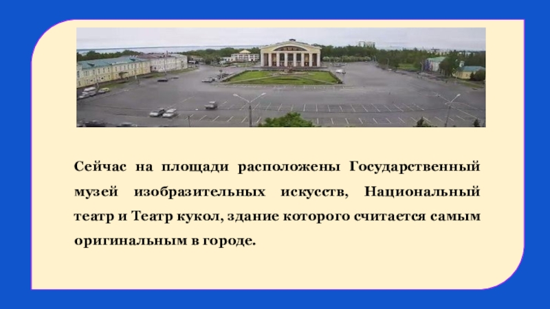 Сейчас на площади расположены Государственный музей изобразительных искусств, Национальный театр и Театр кукол, здание которого считается самым