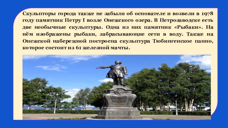 году памятник Петру І возле Онежского озера. В Петрозаводске есть две необычные скульптуры. Одна из них памятник «Рыбаки». На нём изображены рыбаки, забрасывающие сети в воду. Также на Онежской набережной построена скульптура Тюбингенское панно, которое состоит из 61 железной мачты.
