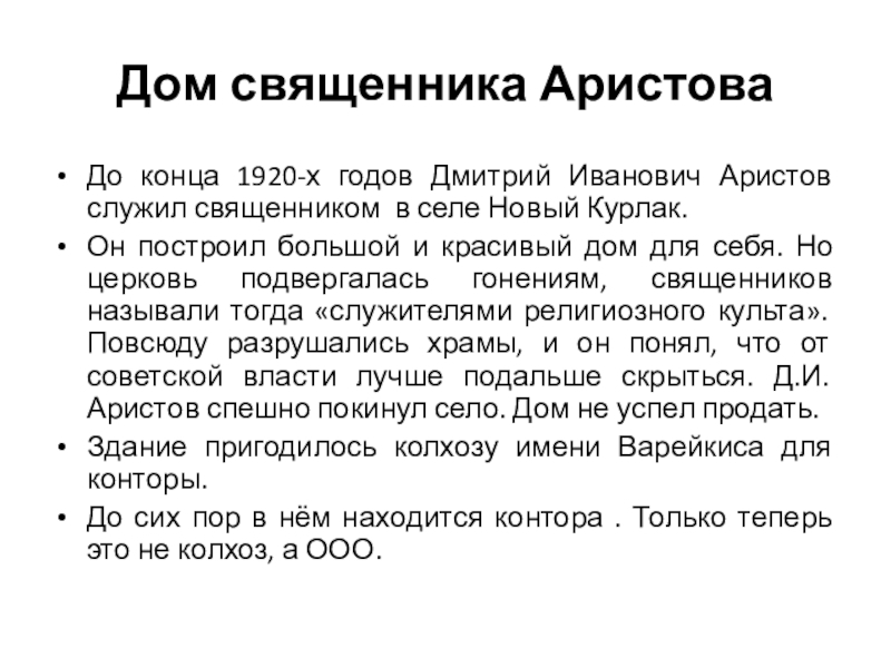 Он построил большой и красивый дом для себя. Но церковь подвергалась гонениям, священников называли тогда «служителями религиозного культа». Повсюду разрушались храмы, и он понял, что от советской власти лучше подальше скрыться. Д.И. Аристов спешно покинул село. Дом не успел продать.