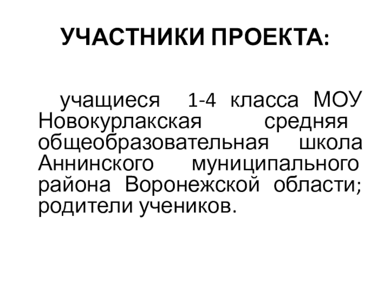 УЧАСТНИКИ ПРОЕКТА:   учащиеся 1-4 класса МОУ Новокурлакская средняя общеобразовательная школа Аннинского муниципального района Воронежской области;
