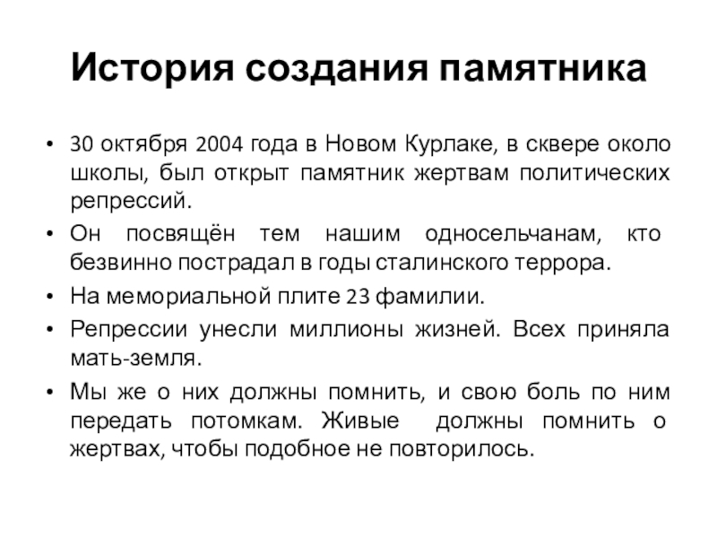 Он посвящён тем нашим односельчанам, кто безвинно пострадал в годы сталинского террора.