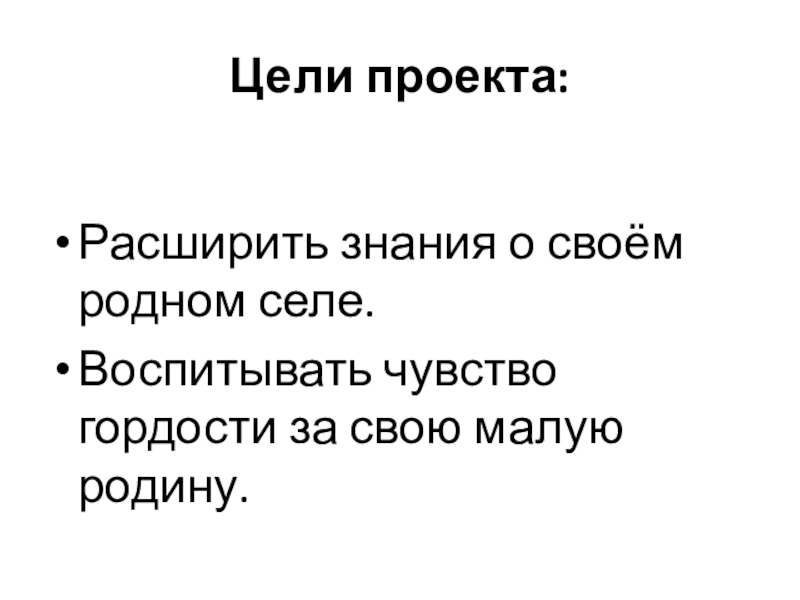 Цели проекта:Расширить знания о своём родном селе.Воспитывать чувство гордости за свою малую родину.