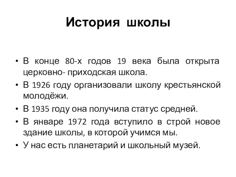 История школы В конце 80-х годов 19 века была открыта церковно- приходская школа.В 1926 году организовали школу