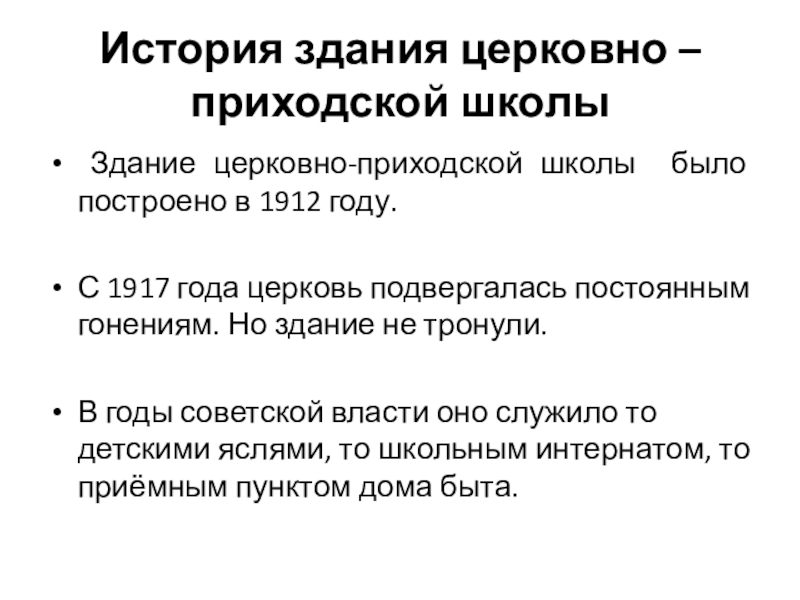 История здания церковно – приходской школы Здание церковно-приходской школы было построено в 1912 году.С 1917 года церковь