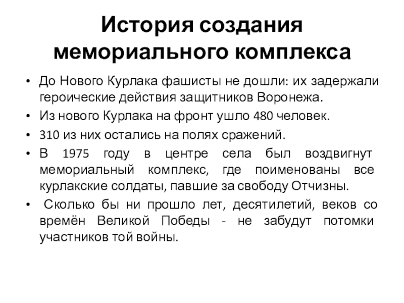 История создания мемориального комплексаДо Нового Курлака фашисты не дошли: их задержали героические действия защитников Воронежа.Из нового Курлака