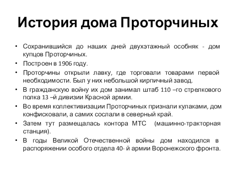 История дома ПроторчиныхСохранившийся до наших дней двухэтажный особняк - дом купцов Проторчиных.Построен в 1906 году.Проторчины открыли лавку,