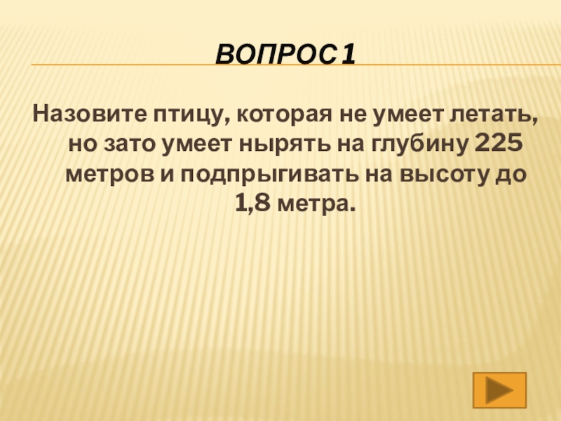Вопрос 1Назовите птицу, которая не умеет летать, но зато умеет нырять на глубину 225 метров и подпрыгивать