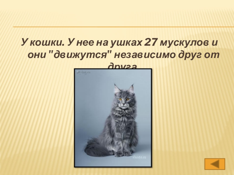 Слайд 6У кошки. У нее на ушках 27 мускулов и они "движутся"