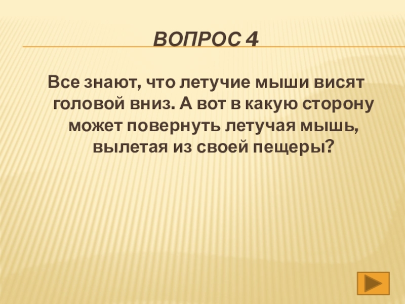 Вопрос 4Все знают, что летучие мыши висят головой вниз. А вот в какую сторону может повернуть летучая