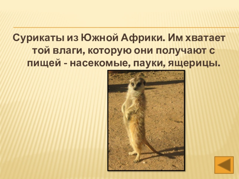 Слайд 12Сурикаты из Южной Африки. Им хватает той влаги, которую они получают