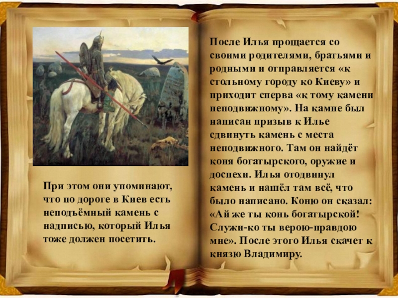 При этом они упоминают, что по дороге в Киев есть неподъёмный камень с надписью, который Илья тоже должен посетить.