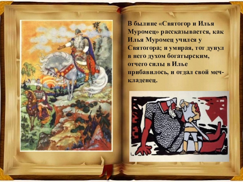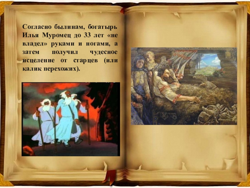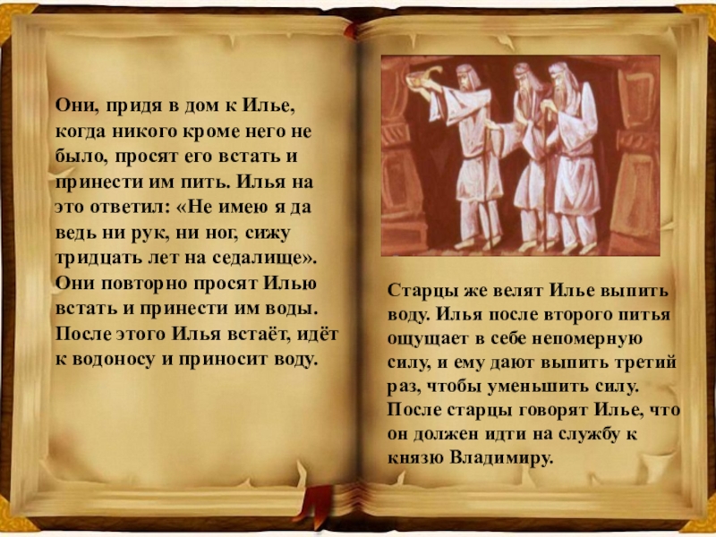 Старцы же велят Илье выпить воду. Илья после второго питья ощущает в себе непомерную силу, и ему дают выпить третий раз, чтобы уменьшить силу. После старцы говорят Илье, что он должен идти на службу к князю Владимиру.