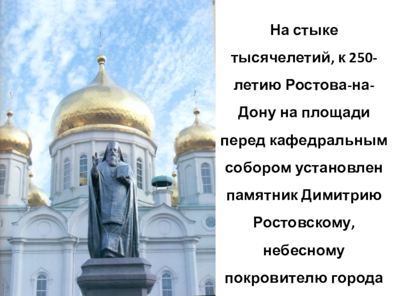 установлен памятник Димитрию Ростовскому, небесному покровителю города