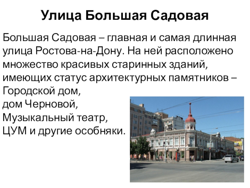 Ростова-на-Дону. На ней расположено множество красивых старинных зданий, имеющих статус архитектурных памятников – Городской дом,