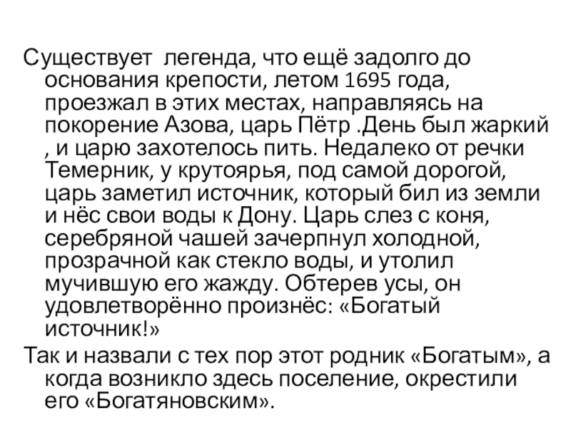 проезжал в этих местах, направляясь на покорение Азова, царь Пётр .День был жаркий , и царю захотелось пить. Недалеко от речки Темерник, у крутоярья, под самой дорогой, царь заметил источник, который бил из земли и нёс свои воды к Дону. Царь слез с коня, серебряной чашей зачерпнул холодной, прозрачной как стекло воды, и утолил мучившую его жажду. Обтерев усы, он удовлетворённо произнёс: «Богатый источник!»