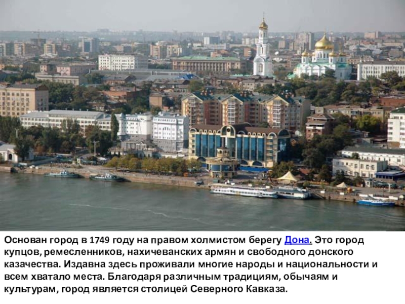 ремесленников, нахичеванских армян и свободного донского казачества. Издавна здесь проживали многие народы и национальности и всем хватало места. Благодаря различным традициям, обычаям и культурам, город является столицей Северного Кавказа.