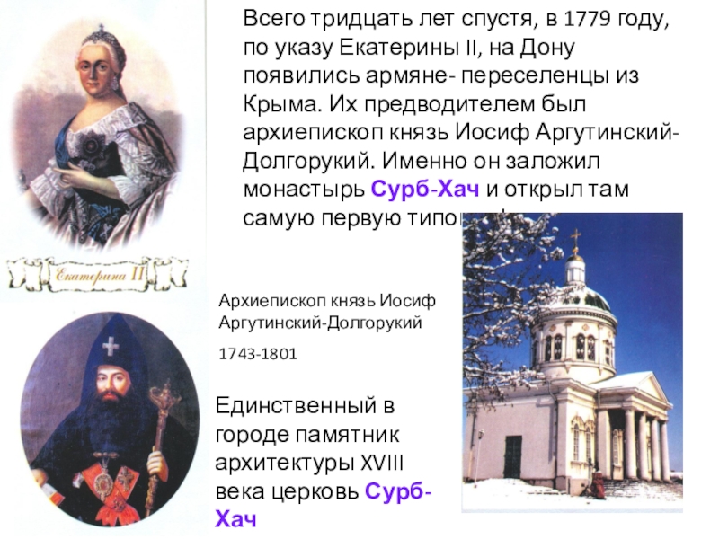 на Дону появились армяне- переселенцы из Крыма. Их предводителем был архиепископ князь Иосиф Аргутинский-Долгорукий. Именно он заложил монастырь Сурб-Хач и открыл там самую первую типографию.