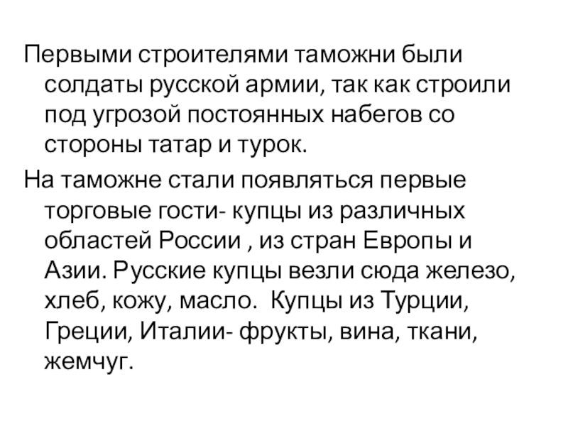 На таможне стали появляться первые торговые гости- купцы из различных областей России , из стран Европы и Азии. Русские купцы везли сюда железо, хлеб, кожу, масло. Купцы из Турции, Греции, Италии- фрукты, вина, ткани, жемчуг.