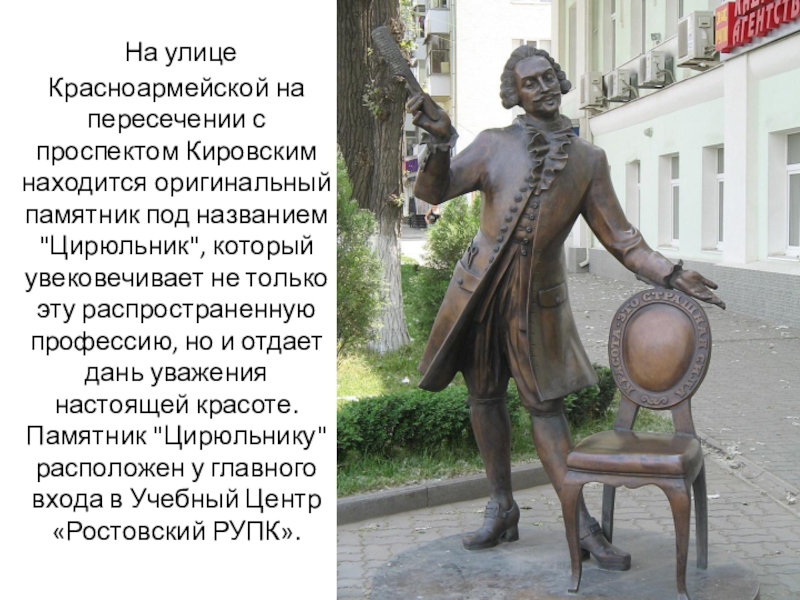 памятник под названием "Цирюльник", который увековечивает не только эту распространенную профессию, но и отдает дань уважения настоящей красоте. Памятник "Цирюльнику" расположен у главного входа в Учебный Центр «Ростовский РУПК».