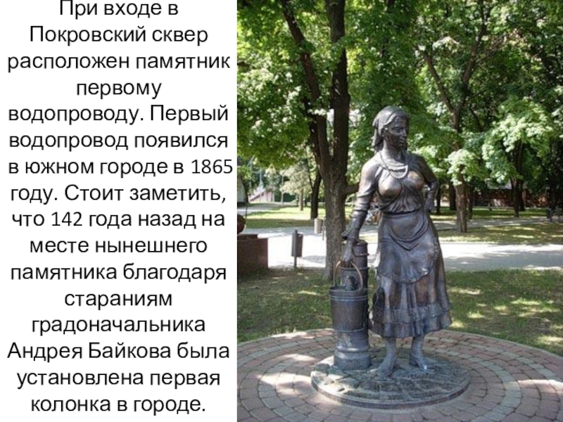 Слайд 59При входе в Покровский сквер расположен памятник первому водопроводу. Первый водопровод