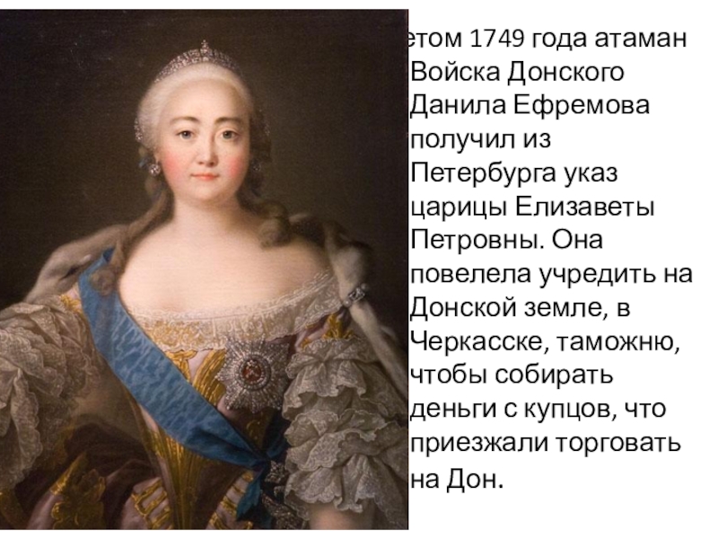 указ царицы Елизаветы Петровны. Она повелела учредить на Донской земле, в Черкасске, таможню, чтобы собирать деньги с купцов, что приезжали торговать на Дон.