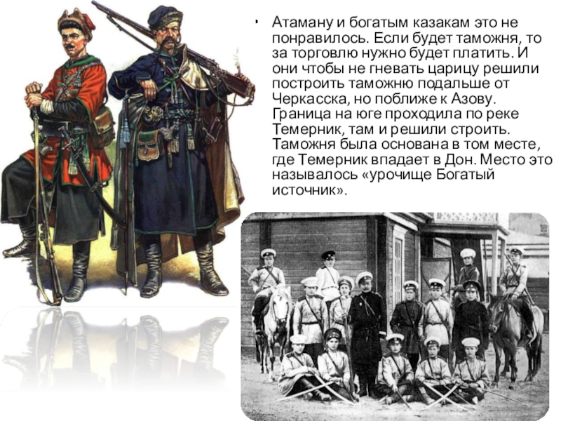 Слайд 8Атаману и богатым казакам это не понравилось. Если будет таможня, то
