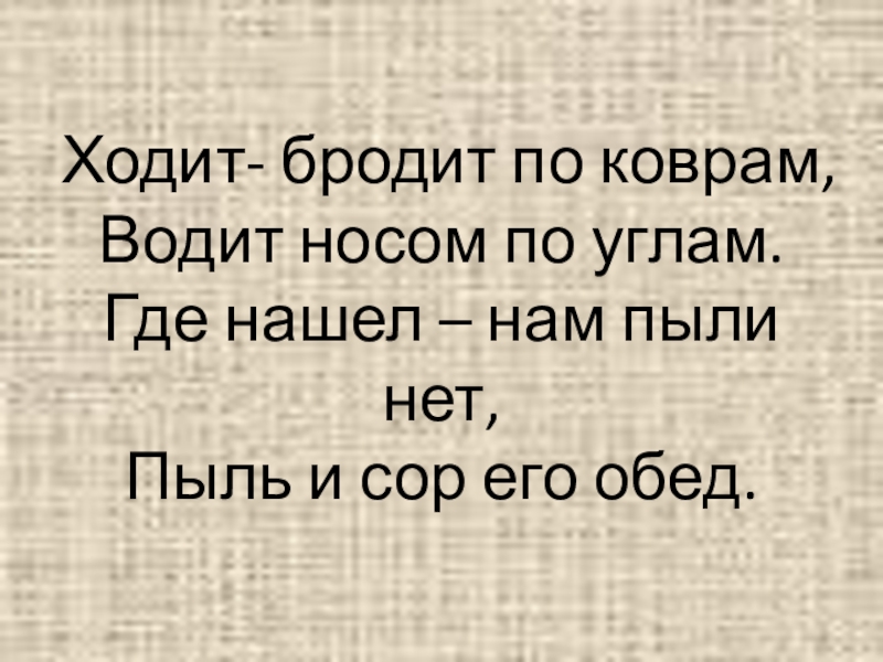 Слайд 7Ходит- бродит по коврам, Водит носом по углам. Где нашел – нам пыли