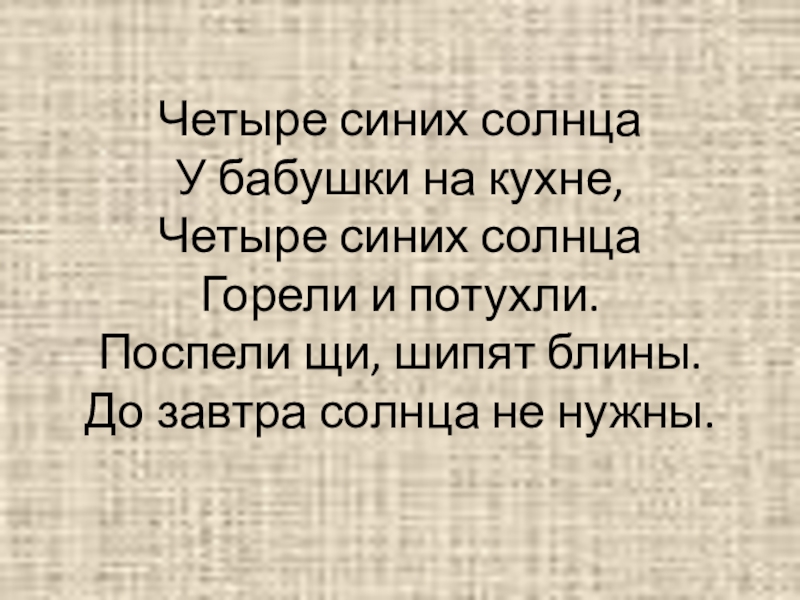 Слайд 4Четыре синих солнца У бабушки на кухне, Четыре синих солнца Горели и потухли. Поспели щи,