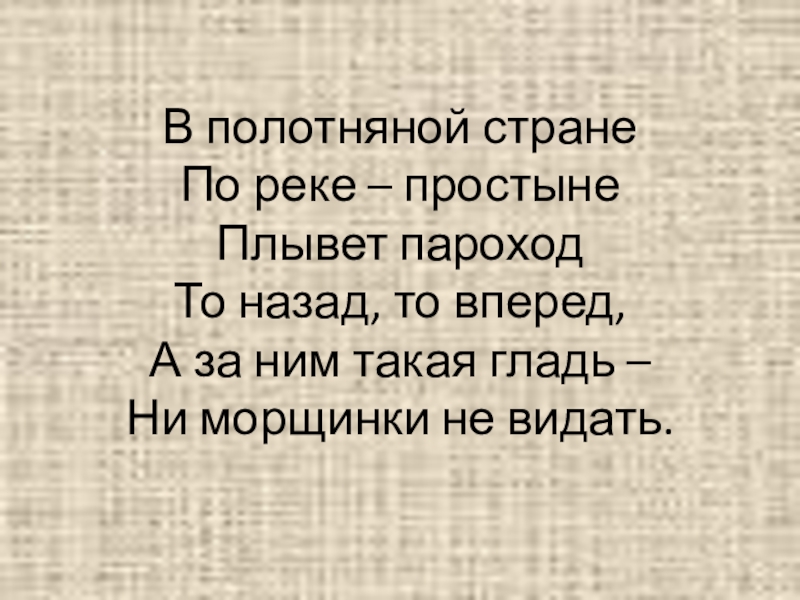 Слайд 9В полотняной стране По реке – простыне Плывет пароход То назад, то вперед, А