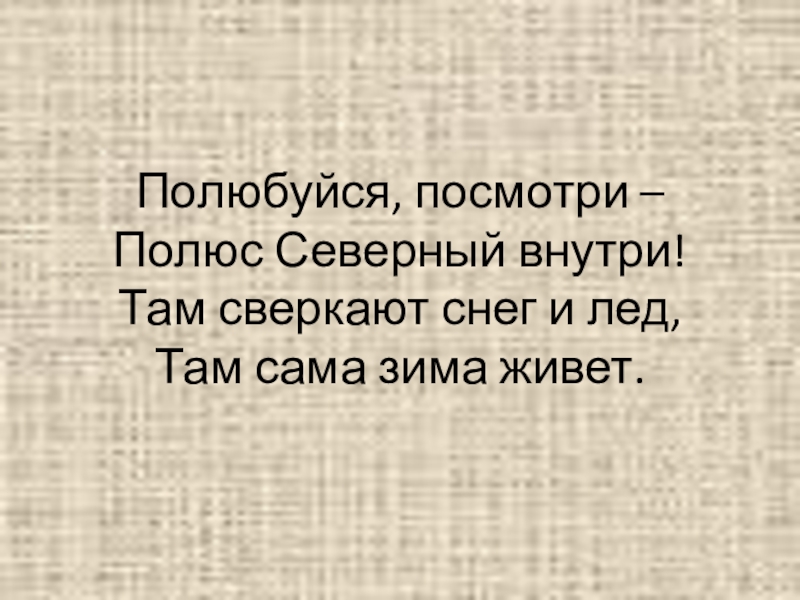 Слайд 11Полюбуйся, посмотри – Полюс Северный внутри! Там сверкают снег и лед, Там сама