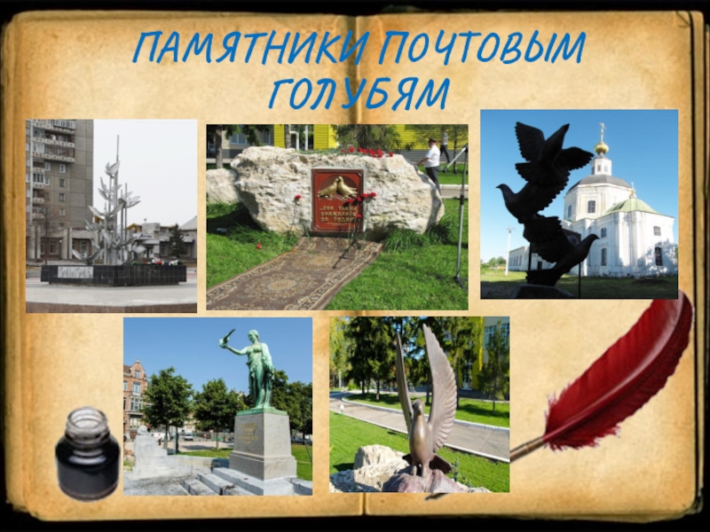 Слайд 6ПАМЯТНИКИ ПОЧТОВЫМ ГОЛУБЯМ