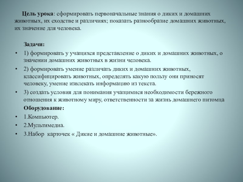 1) формировать у учащихся представление о диких и домашних животных, о значении домашних животных в жизни человека.