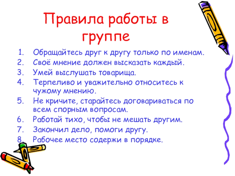Правила работы в группеОбращайтесь друг к другу только по именам.Своё мнение должен высказать каждый.Умей выслушать товарища.Терпеливо и