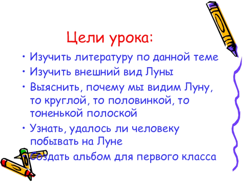 Цели урока:Изучить литературу по данной темеИзучить внешний вид ЛуныВыяснить, почему мы видим Луну, то круглой, то половинкой,