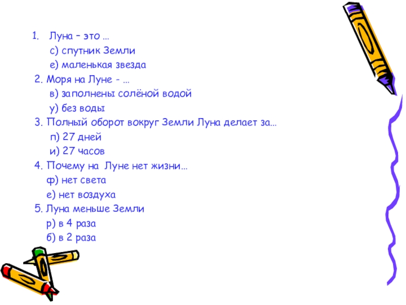 Луна – это …   с) спутник Земли   е) маленькая звезда2. Моря на Луне