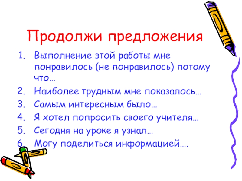 Продолжи предложенияВыполнение этой работы мне понравилось (не понравилось) потому что…Наиболее трудным мне показалось…Самым интересным было…Я хотел попросить