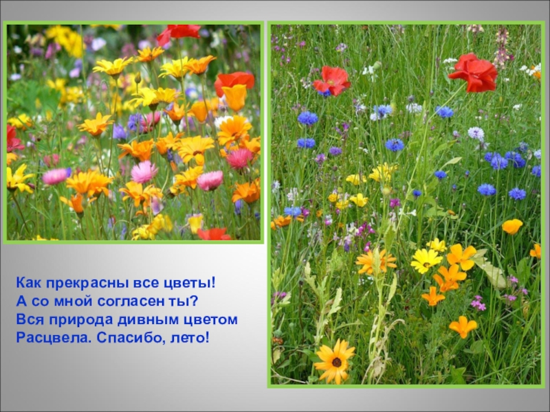 Как прекрасны все цветы! А со мной согласен ты?Вся природа дивным цветомРасцвела. Спасибо, лето!