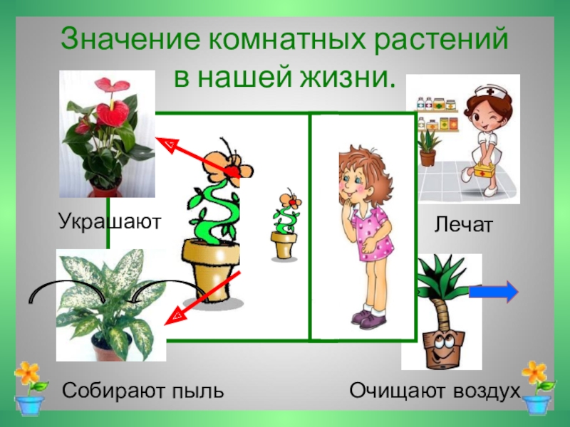 Значение комнатных растений  в нашей жизни.УкрашаютЛечатСобирают пыльОчищают воздух