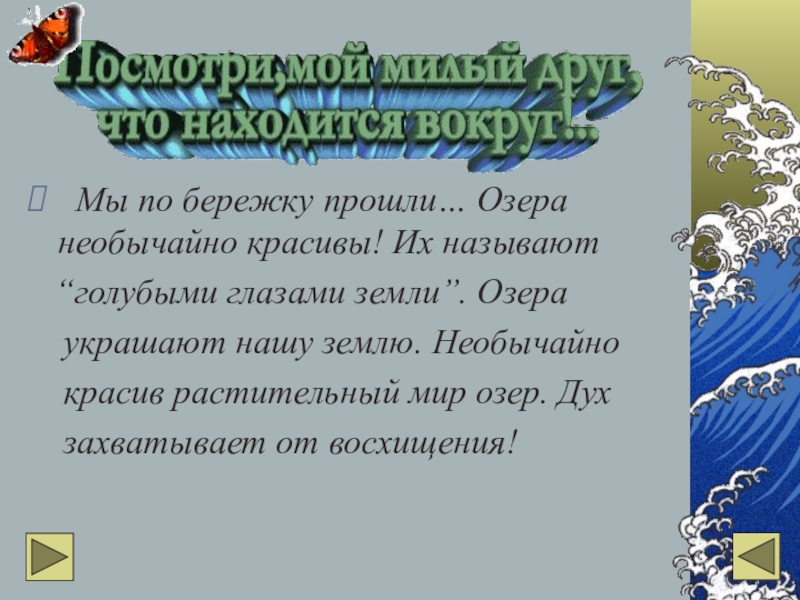 Слайд 2 Мы по бережку прошли… Озера необычайно красивы! Их называют