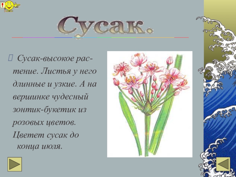 Сусак-высокое рас- тение. Листья у него длинные и узкие. А на вершинке чудесный  зонтик-букетик из розовых