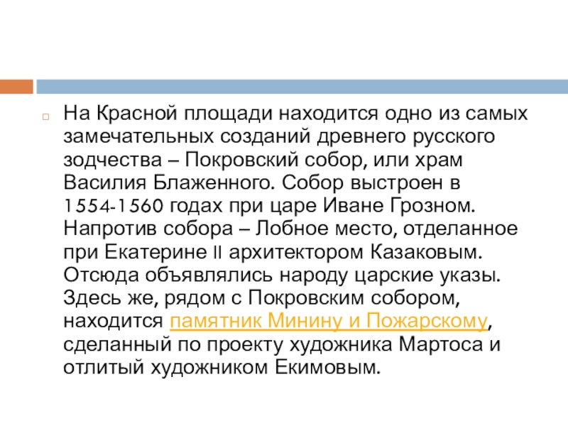 зодчества – Покровский собор, или храм Василия Блаженного. Собор выстроен в 1554-1560 годах при царе Иване Грозном. Напротив собора – Лобное место, отделанное при Екатерине II архитектором Казаковым. Отсюда объявлялись народу царские указы. Здесь же, рядом с Покровским собором, находится памятник Минину и Пожарскому, сделанный по проекту художника Мартоса и отлитый художником Екимовым.