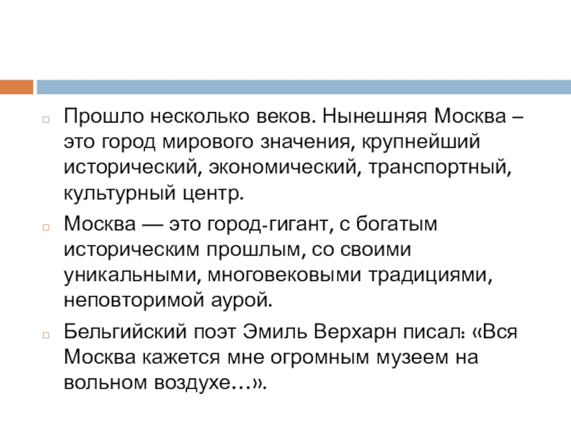 Слайд 5Прошло несколько веков. Нынешняя Москва – это город мирового значения, крупнейший