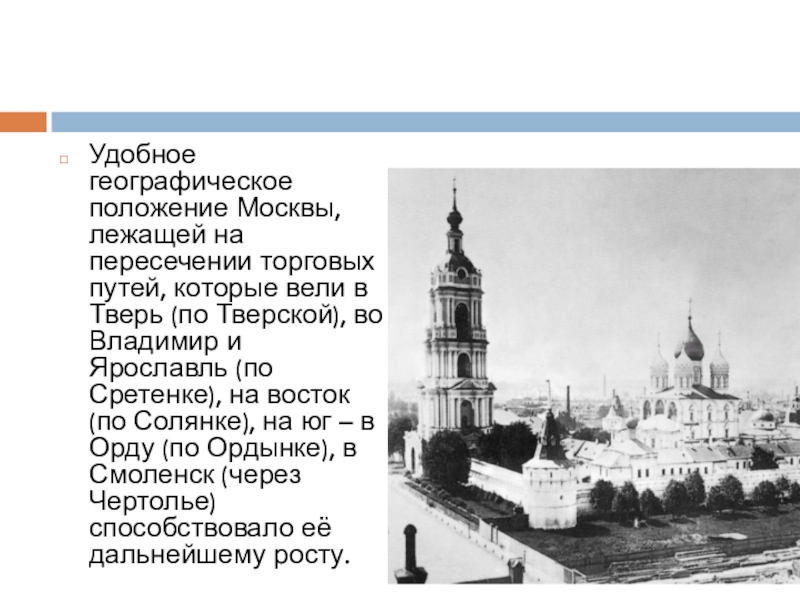 в Тверь (по Тверской), во Владимир и Ярославль (по Сретенке), на восток (по Солянке), на юг – в Орду (по Ордынке), в Смоленск (через Чертолье) способствовало её дальнейшему росту.