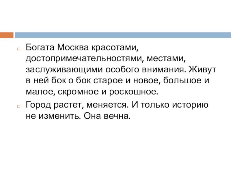 Слайд 8Богата Москва красотами, достопримечательностями, местами, заслуживающими особого внимания. Живут в ней