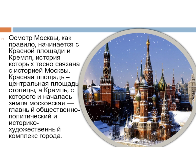 которых тесно связана с историей Москвы. Красная площадь – центральная площадь столицы, а Кремль, с которого и началась земля московская — главный общественно-политический и историко-художественный комплекс города.