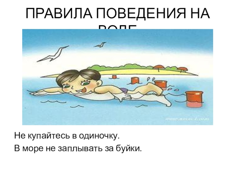 ПРАВИЛА ПОВЕДЕНИЯ НА ВОДЕНе купайтесь в одиночку.В море не заплывать за буйки.